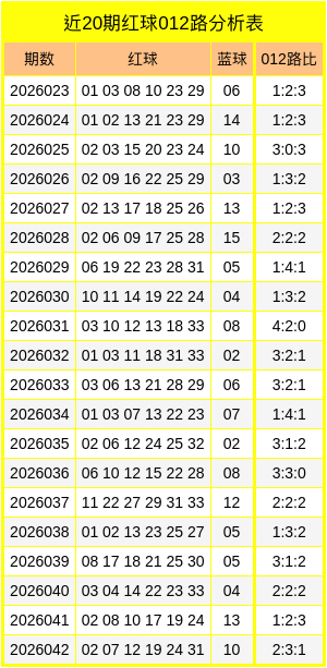 最近20期红球012路比为39:45:36,最近两周红球012路比为11:13:12,上期红球012路比为2:3:1。
